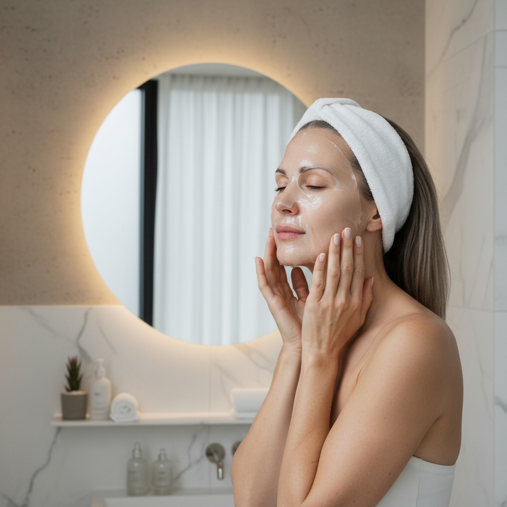 Nach dem Abnehmen die verbleibende Essenz sanft in die Haut einklopfen. Optional danach ein Serum oder Öl für extra Pflege auftragen.