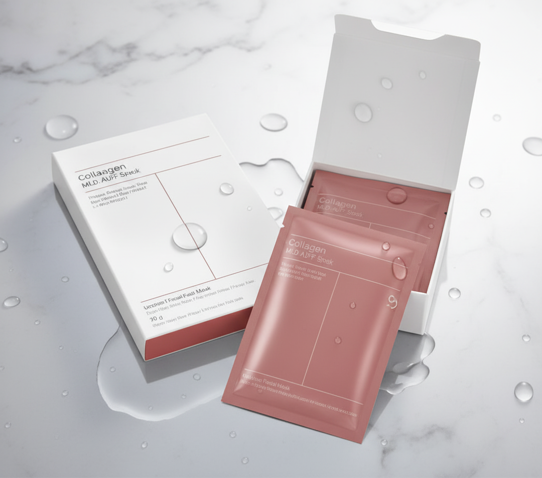 Lege die Kollagen-Gesichtsmaske auf und lasse sie 15–20 Minuten einwirken. Gönn dir eine kleine Auszeit. Die Maske erledigt den Rest.
